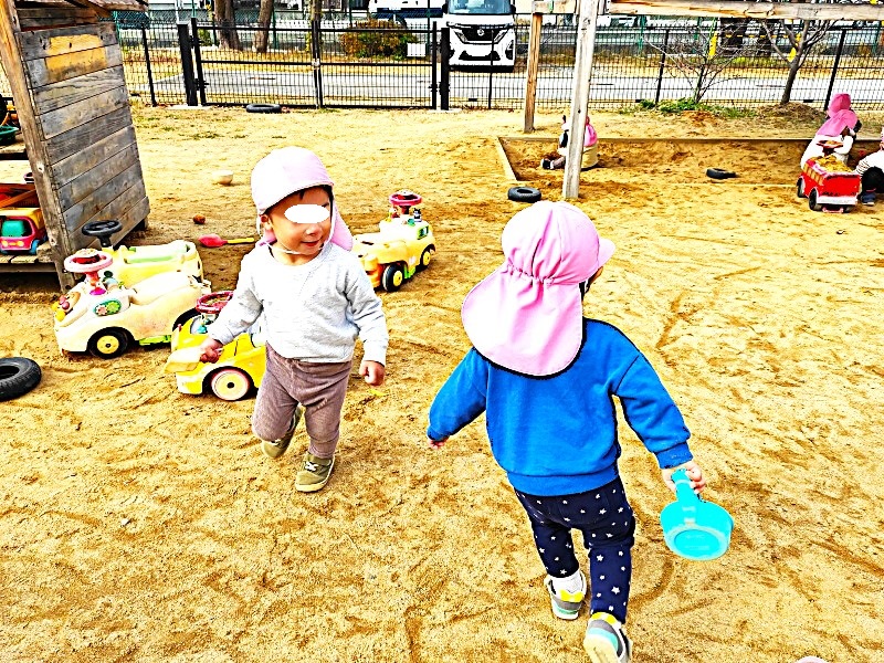 時には仲間との距離が縮まり過ぎることで相手に嫌がられたり、昨日の様に大きい子の所有物を利用しようとすることで制止を受けたりを繰り返しながら、人や物との距離感を少しづつ捉えていくのだと思います。何度伝えても中々理解できない子もいます。しかし長い発達の過程を考えますと、これも一瞬の時間のことだと考えます。