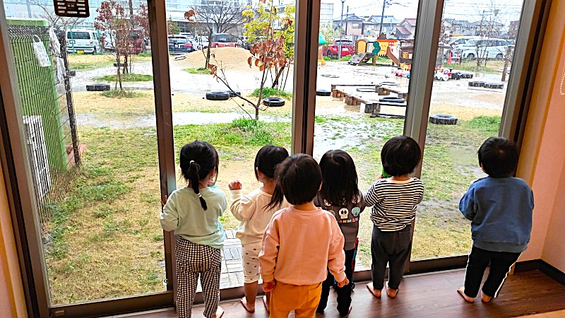 子どもたちは雨降りのお外を眺めながら、どんなことを想像しているのでしょうか?保育室から雨を感じるのは視覚しかありません。地面は濡れ光を反射し、鏡のように様々を映し出してもいます。また生き物たちはどこかに隠れているかな?そんな姿も本当は目の前で見たり、直に手で触れたりすることで理解はさらに深まるはずです。