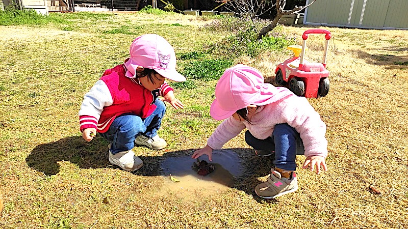 「穴」、「水たまり」はなぜか子どもたちの興味をそそり、様々な「お試し」をしたくなる気持ちが膨れ上がるようです。今日は「カリン」をそっと浮かべ、その性質を楽しみながら試している様子が写し出されています。この物体はなぜ水に浮くのか?では葉っぱは?石は?・・・・次々といろんなものを水たまりに放り込むことで、その正解を見つけ出そうとしているかのようです。