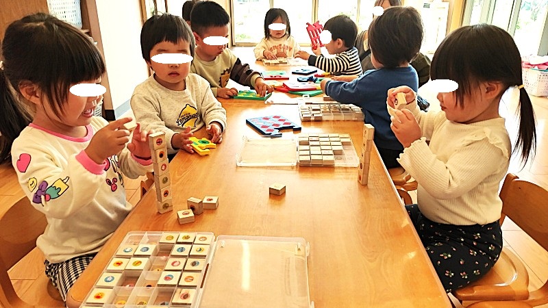 だから異なる素材を同じ机の上で隣同士で行うことも、「意図的」、「計画的」に行っているのであれば、素晴らしい教育場面と言えます。偶然にもこのような場が出来たとしても、子どもにとってはとても面白い環境と言えるのです。