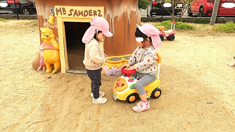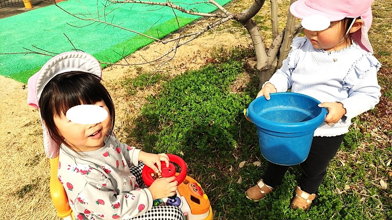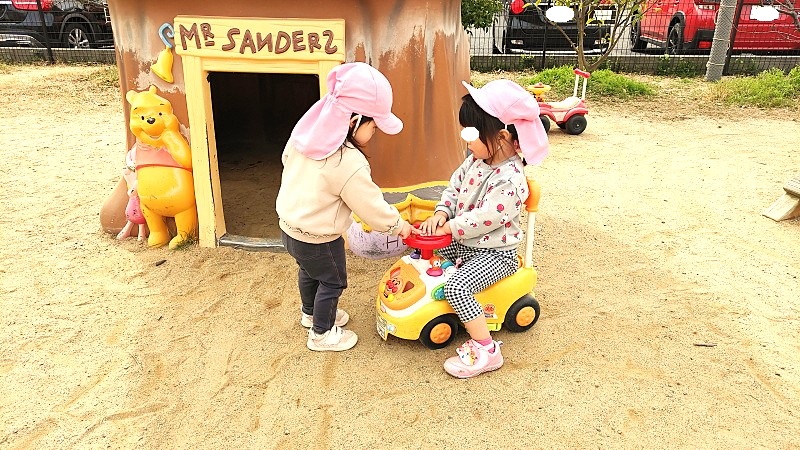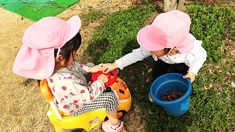 ドングリをあげるあげない、わたすもらうの場面が、お互いの思いがうまく合えば「笑顔」になり、合わなければ「悲しいさや怒りの表情」となって相手に発信されます。同じ園庭活動の中で、人が変わればそれぞれの発達段階や性格によって、上手くいったりいかなかったり、そんな時間を重ね過ごしていくことで特定の相手は見つかっていくものです。